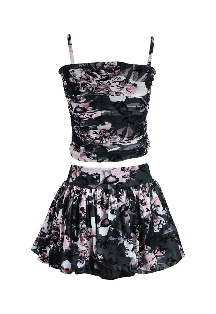 Tulle Net Black Pink Floral Rusched Top